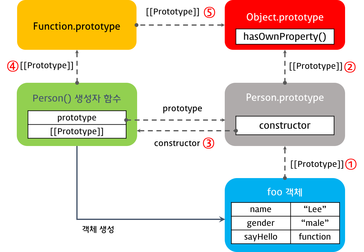 Person 생성자 함수에 의해서 me라는 객체가 생성되었는데 이아이는 Object.prototype에 있는 메서드인 hasOwnProperty를 호출할 수 있다. 이처럼 부모 역할을 하는 프로토타입 객체를 찾아 해당 프로퍼티 혹은 메서드를 불러올 수 있는 것이다.